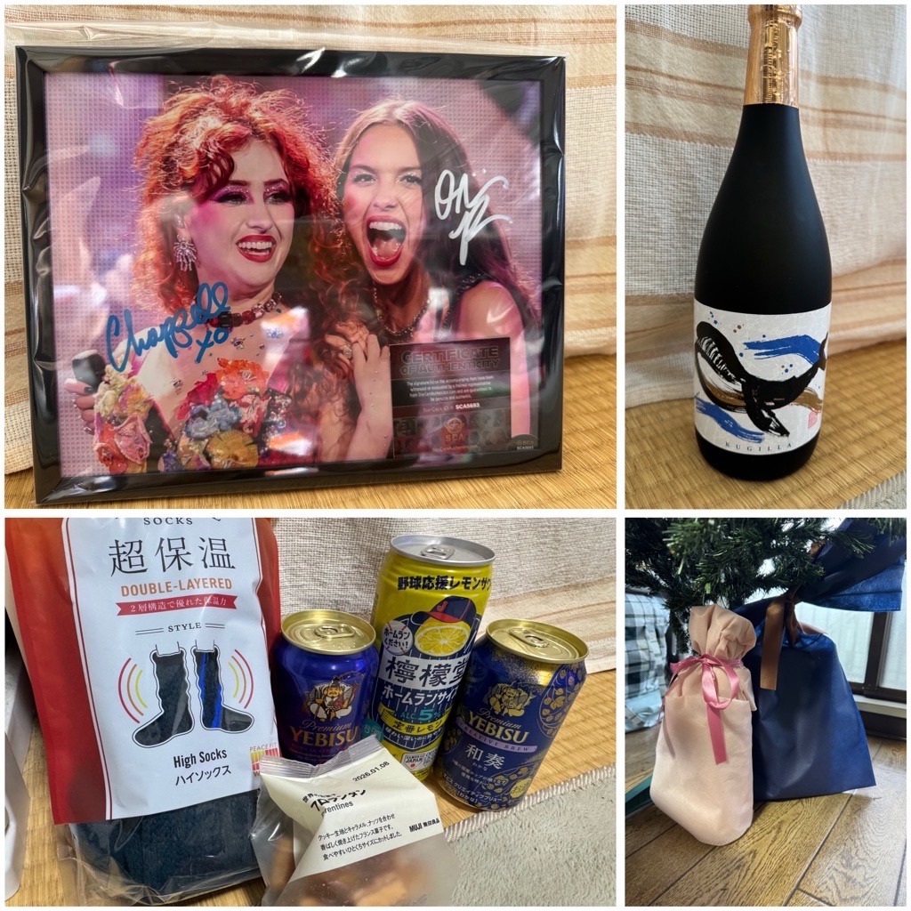 娘にはオリヴィア×チャペルローンのサイン入りポートレート、私は芋焼酎、主人はビールやあったか靴下など。
