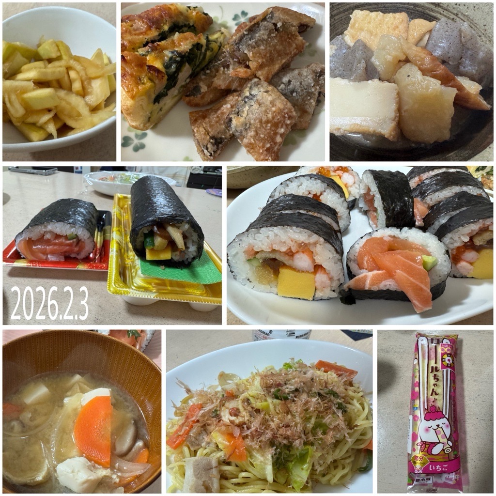 娘が太巻きあまり食べないから、ここ数年手巻き寿司にしてたけど、最近焼き海苔が高い。+手巻き用寿司ネタ買ってると、恵方巻き買うのと同じくらいの金額になりそうだったから、ラクして恵方巻きを購入。娘はサーモンだったら食べるしね。丸かぶりも方角も気にせず、切って食べました笑笑