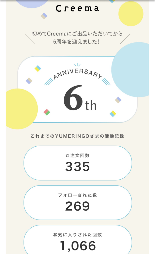 creemaも初出品から6周年らしい。たくさんの人たちにYUMERINGOを見つけていただき、購入していただき、感謝いっぱいです💜