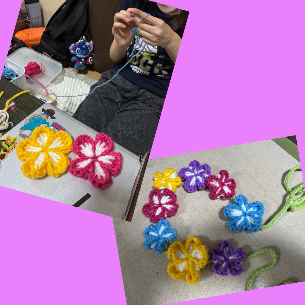 勉強の合間にお花モチーフ作ってたよ。つなげて、ベルト風に身につけるらしい。