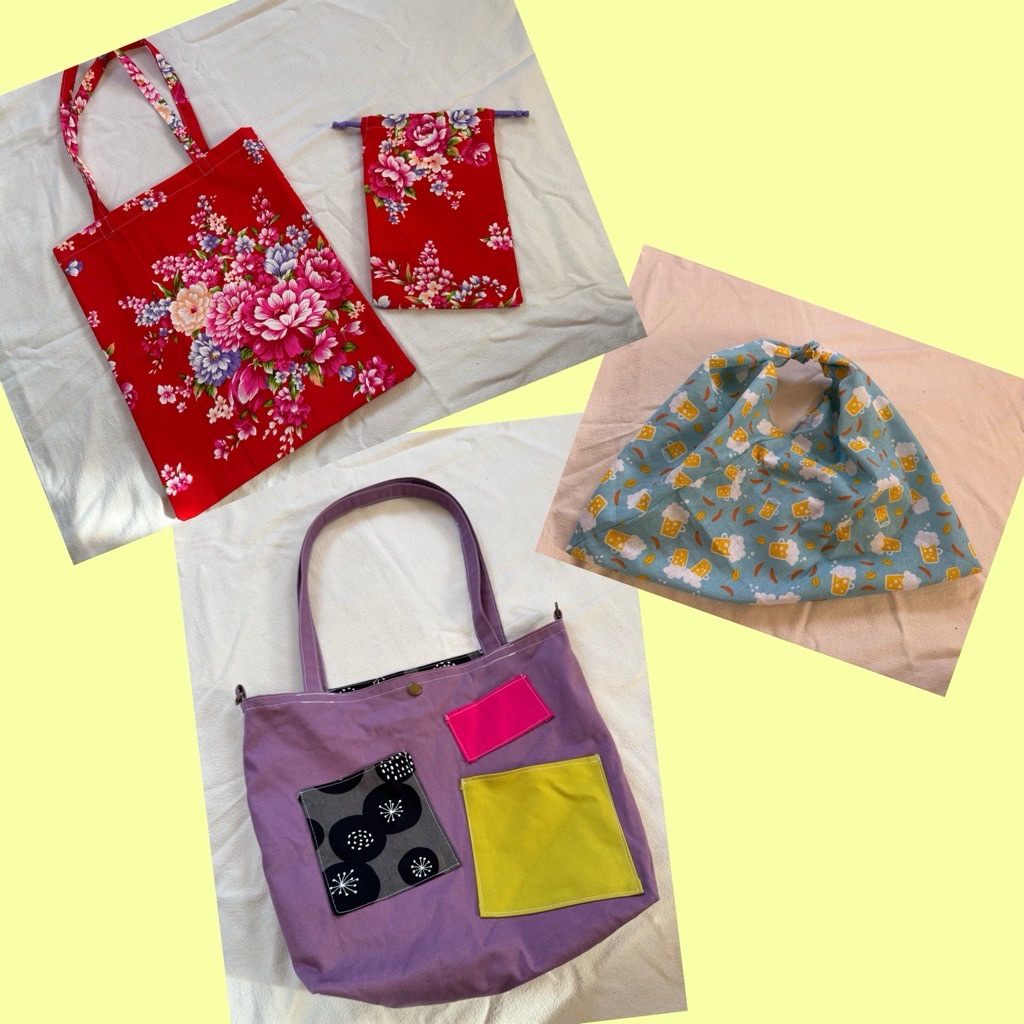 仕事用のバッグの持ち手がボロボロになってたので、以前作ってたショルダーバッグをトートバッグにリメイク(↓紫色の)。持ち手を付けただけなんだけどね。ポケットいっぱい付けてるから使いやすい😊
